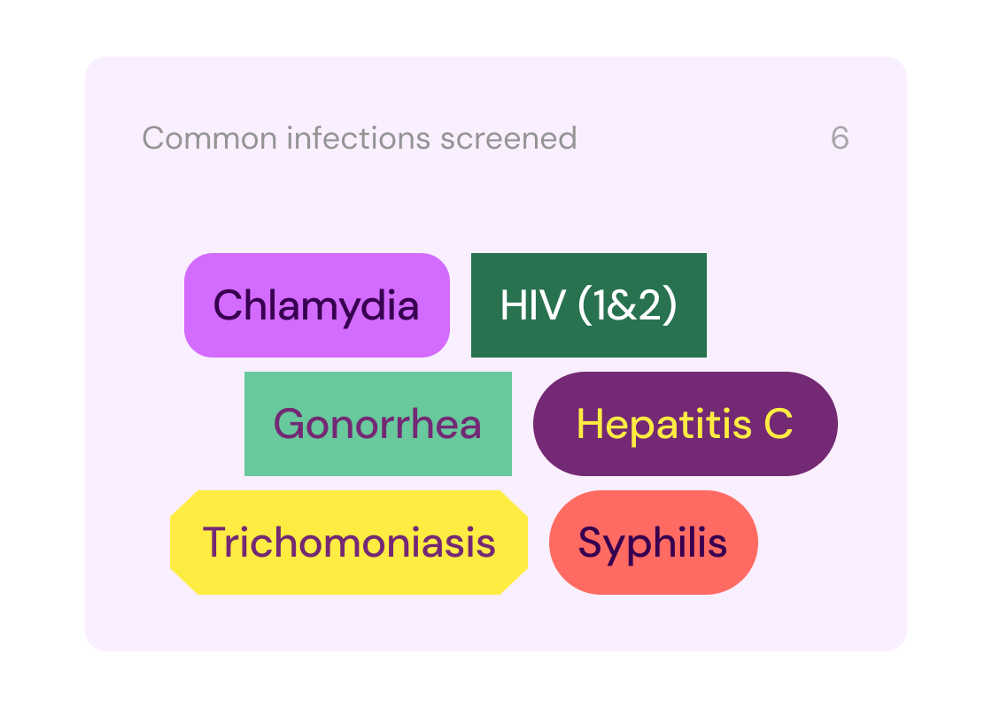 Our at-home lab test screens for chlamydia, gonorrhea, hepatitis C (HCV), human immunodeficiency virus (HIV), syphilis, and trichomoniasis. If your results are abnormal or positive, you’ll be able to connect with our independent physician network at no additional cost and may be eligible to receive treatment.
